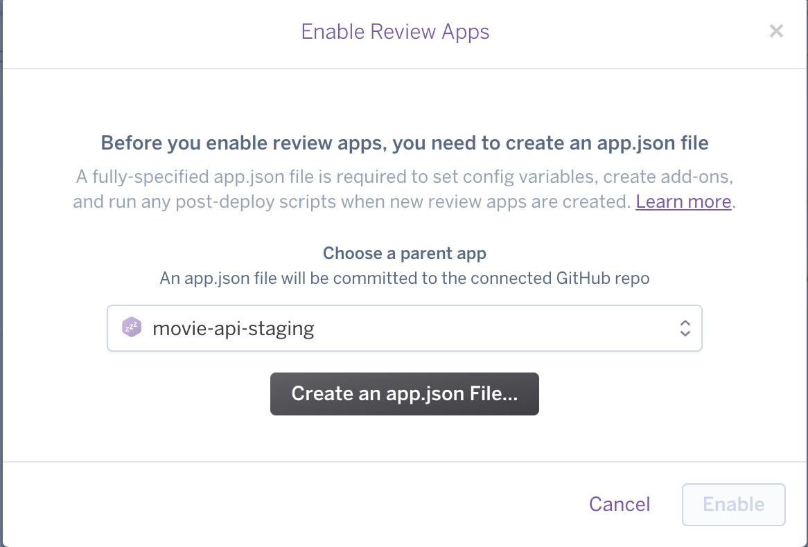 Next, enable Review Apps by clicking the Enable Review Apps... button.