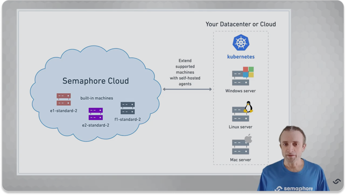 Run jobs in the cloud, on your own machines, or both — with all the power of Semaphore. Set up clusters in minutes, no control plane worries needed.